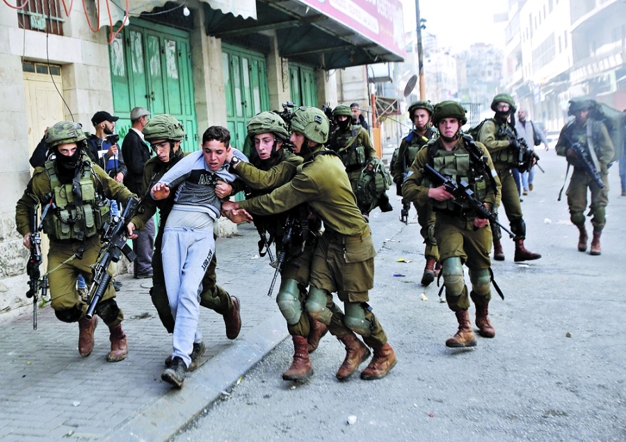 جنود إسرائيليون يعتقلون صبيا فلسطينيا خلال احتجاج في الخليل بالضفة الغربية المحتلة في 23 فبراير 2018. REUTERS/Mussa Qawasma