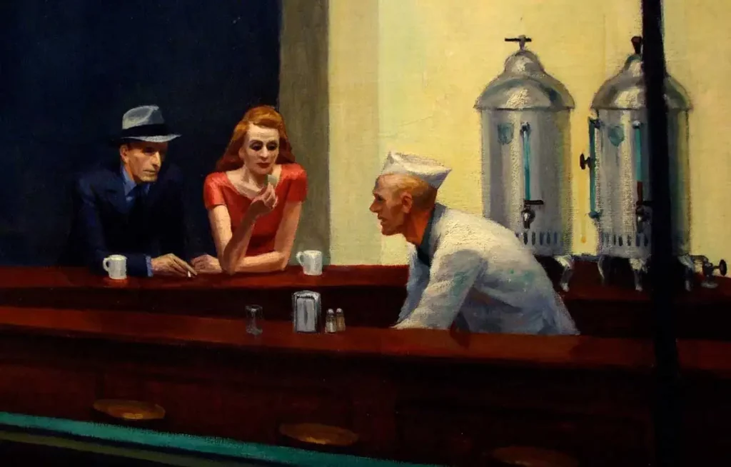 اعتاد الفنان الأمريكي إدوارد هوبر أن يدوّن ملاحظات عن لوحاته في مفكرة شخصية صغيرة يحملها معه دائما، كتفاصيل الألوان وأماكن الضوء والظل في المشهد. وما قرأناه في السطور السابقة هو ما كتبه في وصف لوحته “صقور الليل”، واصفا لوحته التي تصوّر ذلك البار الهادئ الذي يقع في زاوية مظلمة من أحد شوارع وسط المدينة، في ساعة متأخرة من الليل، حيث نرى ثلاثة أشخاص، أحدهم يجلس وحيدا يعطينا ظهره، والآخران رجل وامرأة يجلسان متجاورين أمام النادل.